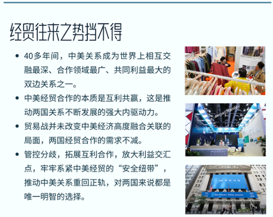 回看历史,中美经贸合作凝聚着几代人的政治智慧和不懈努力。从50年前“乒乓外交”为中美关系破冰,到21世纪初美方签署对华永久正常贸易关系法案,再到建立多个机制性对话增信释疑,中美之间有分歧,更拥有广泛的共同利益和合作需求。正如1972年美国总统尼克松访华时所说:“使我们走到一起的,是我们有超过这些分歧的共同利益。”