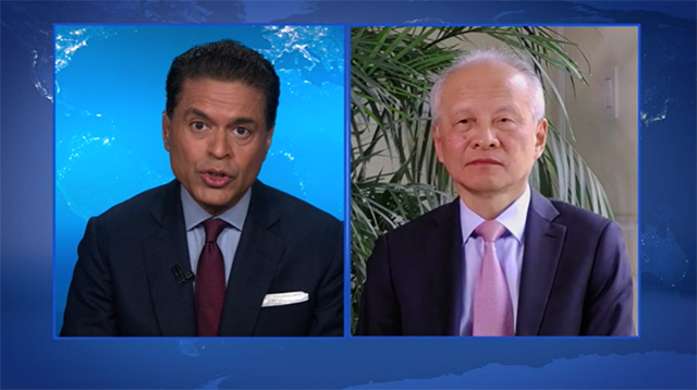 扎卡里亚:大使,我已问了您很多美国人关心的问题,最后,能否请您谈一下中国现在氛围如何。中国已控制住疫情,经济实现复苏。中国外交政策制定者和中国民众如何看待中美关系?