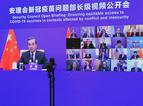 国务委员兼外长王毅2021年2月17日在北京以视频方式出席联合国安理会新冠疫苗问题部长级公开会,并发表题为《以人民为中心加强全球抗疫合作》的讲话。