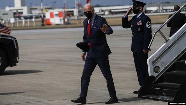 拜登总统走下"空军一号"专机,参加宣言1万9千亿美元的新冠疫情救助方案的活动。(2021年3月23日)