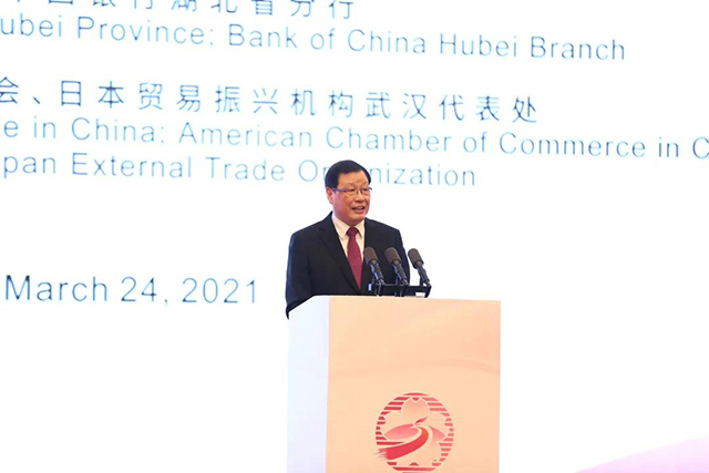 下午的经贸洽谈会上,湖北省委书记应勇代表湖北省委省政府发表致辞。他向长期以来关心支持湖北发展的各国各界朋友表示衷心感谢,并表示在中央一揽子政策支持下,湖北先后出台促进经济社会加快发展、优化营商环境等方面政策,为包括在鄂世界500强在内的各类企业加快复工复产、复商复市提供服务,全省经济社会加快全面恢复,焕发出蓬勃生机活力。同时,应勇书记诚挚邀请各国各界朋友来湖北考察访问、投资兴业,与湖北共享发展机遇,共创美好未来。