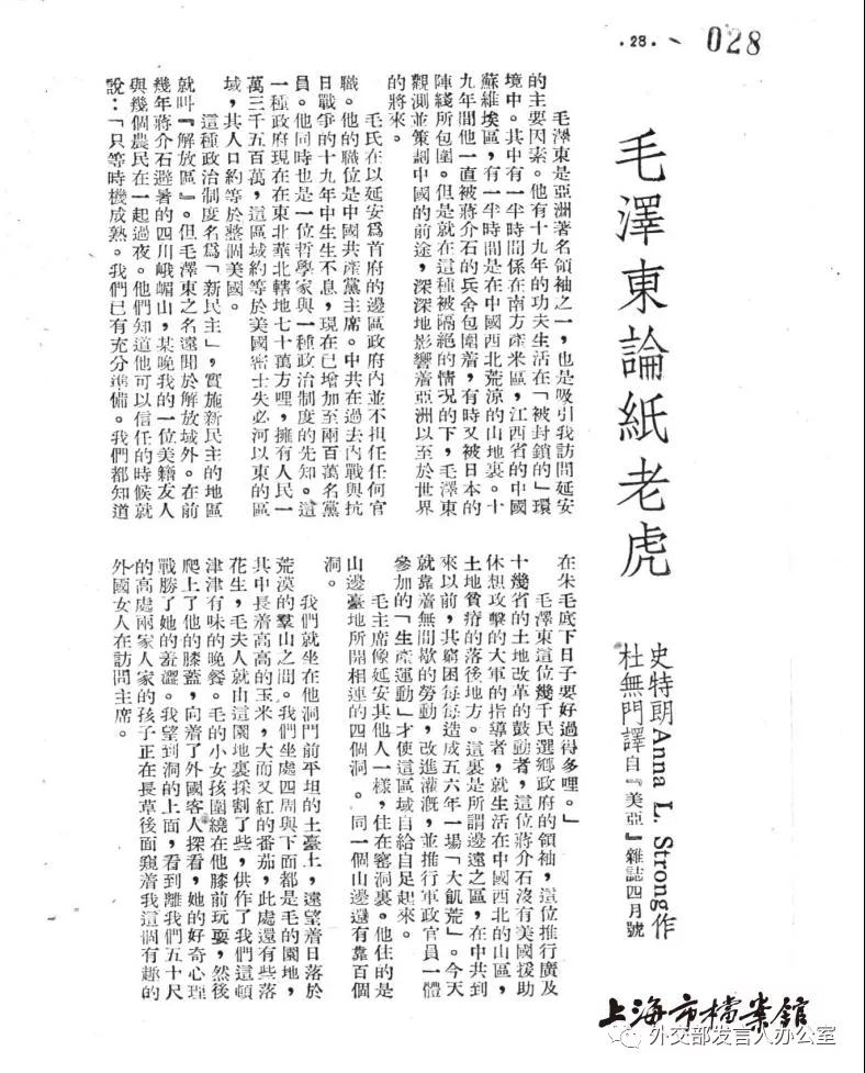 斯特朗的文章《毛泽东论纸老虎》刊登于美国《美亚》杂志(来源:上海市档案馆)