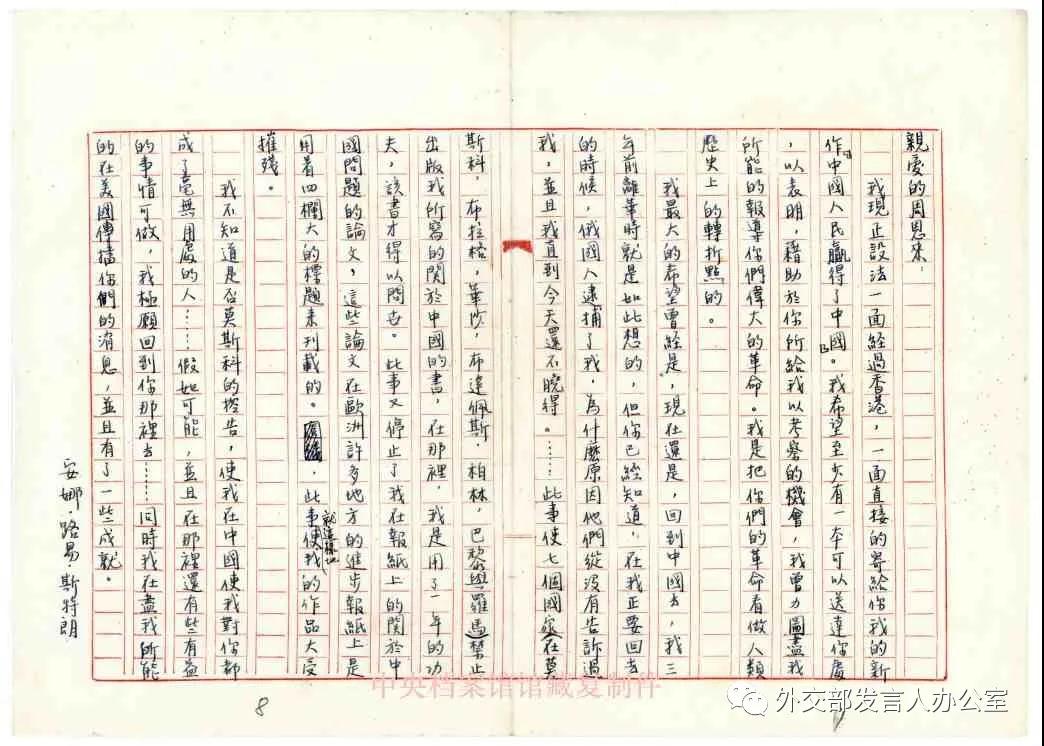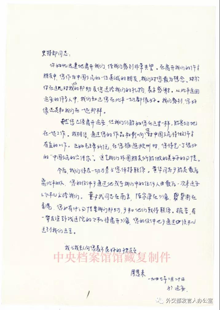 1947年2月20日,周恩来致安娜•路易斯•斯特朗信,其中说到:“毛主席说,……你是中国人民很好的宣传家”