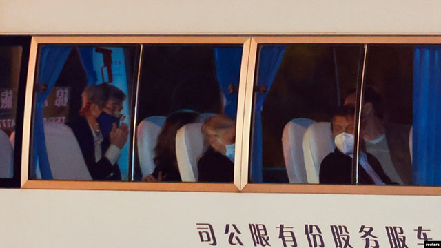 美国气候特使约翰·克里一行乘坐面包车抵达上海的下榻酒店。(2021年4月14日)