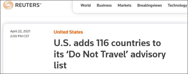3月22日,全美26个旅行业和航空业组织联名致信白宫新冠疫情应对小组,呼吁拜登在今年5月1日前取消国际旅行限制。信中提及,2020年前往美国的海外游客减少81%,给美国造成1460亿美元的经济损失,若不解除旅行禁令,到2021年底,美国或将有110万个工作岗位无法恢复,经济损失将高达2620亿美元。