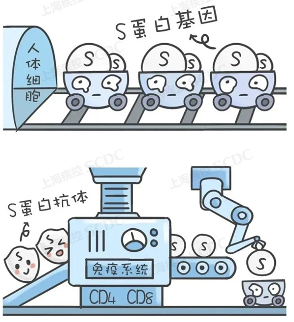 首先是技术原理不同,这个疫苗的腺病毒载体,是剔除了腺病毒(这里用的是人5型腺病毒,Ad5)中与复制相关的基因,这样病毒就不会在人体中复制。再把新冠病毒刺突蛋白(S 蛋白)的基因插入进去。这个新插入基因让重新组装的病毒进入人体后,可以在体内复制出新冠病毒刺突蛋白,我们的免疫系统发现刺突蛋白后会启动免疫应答,同时记住它的样子,下次碰到真的新冠病毒就会马上做出反应清除它们。