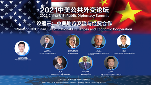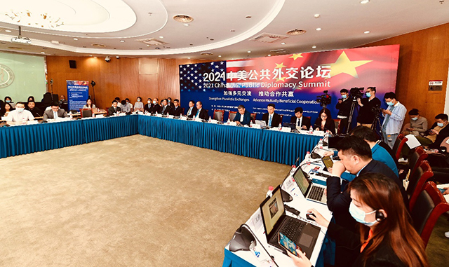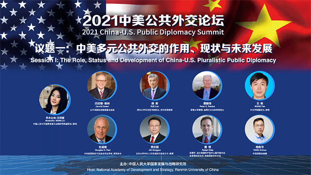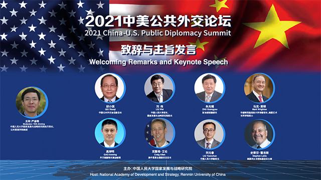 2021年5月15日上午,2021中美公共外交论坛在中国人民大学成功举办。此次论坛的主题是:加强多元交流,推动合作共赢。论坛由中国人民大学国家发展与战略研究院主办,中国公共外交协会和中国人民大学新闻学院支持。此次论坛以线上线下相结合的方式进行,并通过百度APP、中国网等媒体平台进行中英文同步网络直播。据不完全统计,近50万人在线参加了论坛。