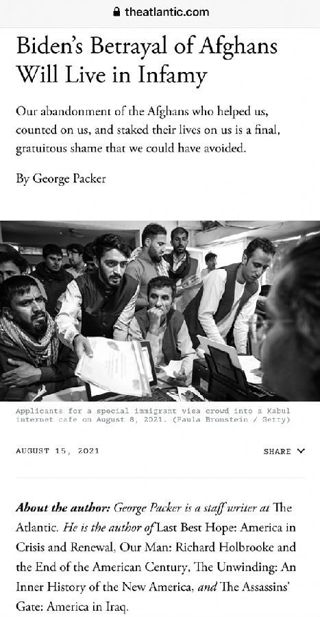 《大西洋月刊》发表了一篇标题为《拜登对阿富汗人的背叛将活在耻辱中》(Biden’s Betrayal of Afghans Will Live in Infamy)的报道,该报道宣称这场失败的耻辱重担落在了拜登身上。