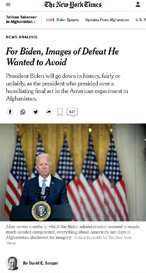 《纽约时报》资深作家大卫·E·桑格(David E. Sanger)写道:“拜登上任时的外交政策经验比近期记忆中的任何一位总统都要多,但仍因执行不力而给他的遗产留下了污点。”“拜登将被载入史册,无论公平或不公平,作为主持美国在阿富汗试验中酝酿已久、屈辱的最后一幕的总统。” “即使是拜登总统的许多盟友,也认为他最终退出了一场美国无法获胜且不再符合其国家利益的战争是正确的决定,但他们承认拜登在执行撤军时犯了一系列重大错误。”