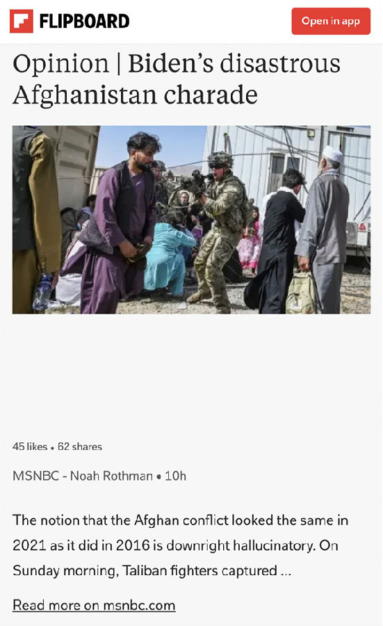 MSNBC 的网站头条标题为“拜登灾难性的阿富汗骗局”(Biden’s disastrous Afghanistan charade)。
