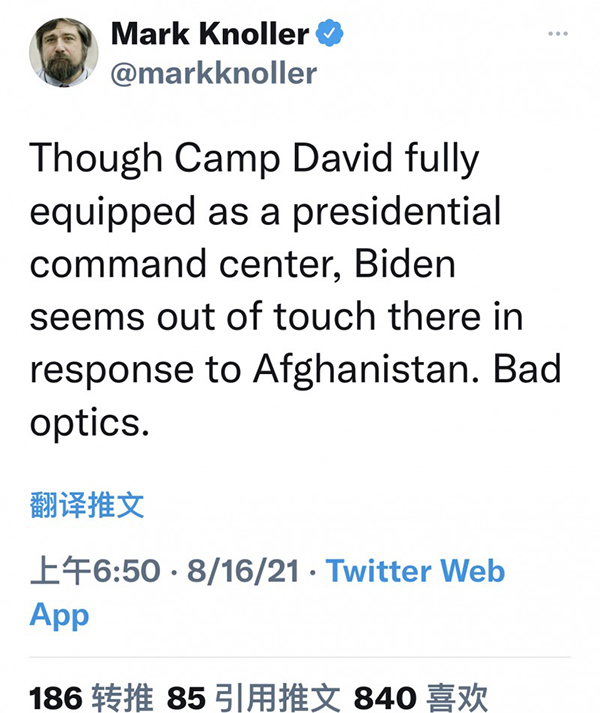 诺勒在推特上说:“尽管戴维营作为总统指挥中心配备齐全,但拜登在那里似乎与阿富汗脱节。”拜登与外界 “信息失联。”