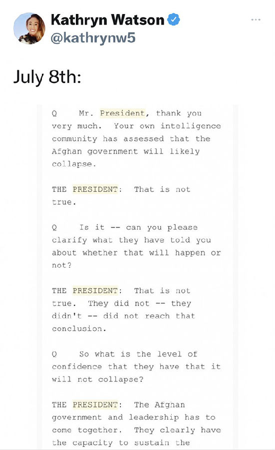 哥伦比亚广播公司(CBS)记者凯瑟琳沃森(Kathryn Watson)在 7 月 8 日的新闻发布会上发布了推文,当时拜登告诉记者,阿富汗政府及其领导层“显然”有能力维持政府的正常运作。