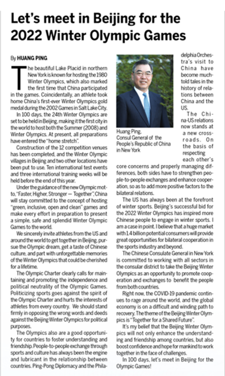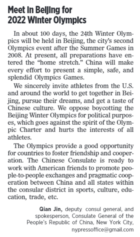 该报评论版同日同期刊发我馆副总领事兼发言人钱进有关表态,介绍中国冬奥会各项准备工作已经就绪,中国将向世界呈现一届简约、安全、精彩的冬奥会,欢迎美国冬奥健儿齐聚北京实现冬奥梦想,坚决反对将体育运动政治化的错误言行,并展望与领区各界深化交流合作的良好愿景。