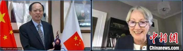 北京时间3月22日上午,国家体育总局局长、中国奥委会主席苟仲文以视频形式会见了美国奥委会主席苏珊·利昂斯,并接受美国奥委会赠予的荣誉奖杯。