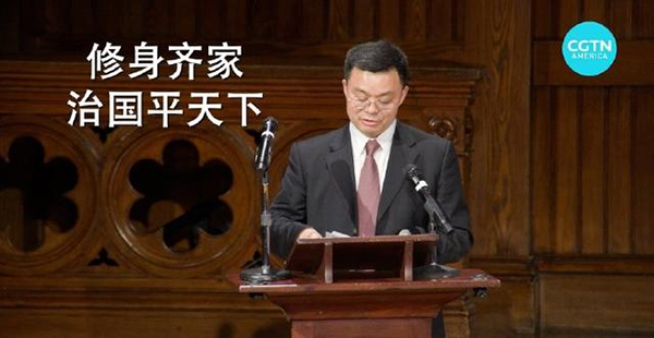 秦大使说,“中美关系面临严峻复杂的局面,误解误判的乌云在聚积,所谓‘新冷战’的坚冰在凝结。” “双方要开展更加广泛、深入、坦诚、开放的交流对话,用事实真相和真理的力量,打破误解偏见固化成的所谓‘一般常识’,打破冥顽不化的‘政治正确’,打破当前不符合两国利益、背离两国民意的僵冷局面。” “祝愿本届哈佛中国论坛,能够集思广益,出谋划策,掀起又一场头脑风暴,帮助吹散误解误判的乌云,希望每位论坛参与者都能成为‘破冰者。’”
