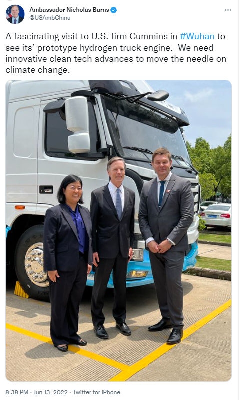 昨天在武汉,伯恩斯大使走访了美国康明斯公司。大使在推特上说:“在武汉访问了美国康明斯公司,看了他们的氢燃料电池卡车发动机样机,大开眼界。我们需要创新的新技术进步来对气候变化产生显著影响。”
