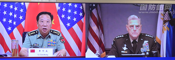 米利7日与李作成视频通话。(图片来源:中国国防部官网)
