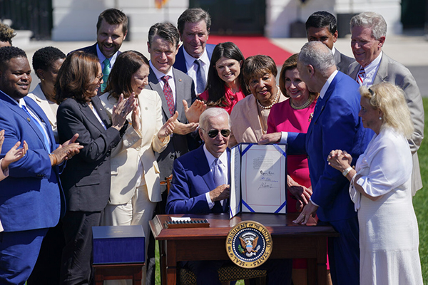 图为9日,拜登签署《芯片与科学法案》后,在白宫南草坪举行的庆祝活动中手拿签署文件。(图片来源:美联社)
