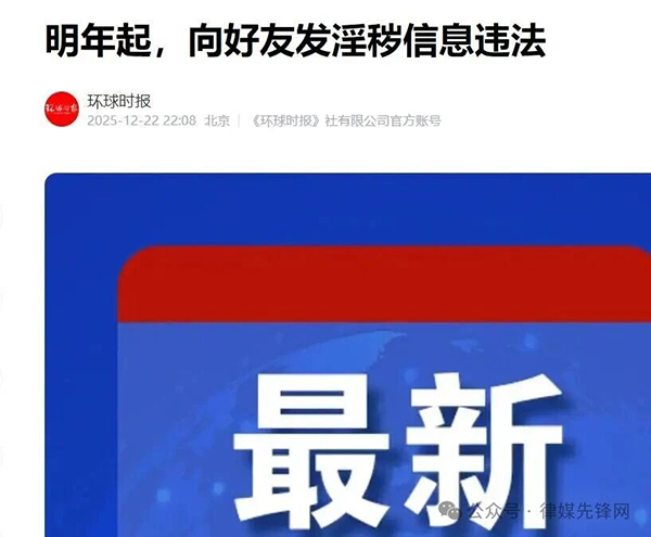 《环球时报》2025-12-22 “明年起,向好友发淫秽信息违法”文章:2026年1月1日起,新修订的《中华人民共和国治安管理处罚法》将正式施行,其中第八十条对传播淫秽信息的处罚规定作出明确细化,对传播淫秽信息加大了处罚力度。