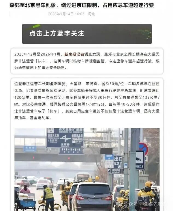 1、新闻来源:2025年12月至2026年1月,新京报记者调查发现,燕郊与北京之间长期存在大量无牌非法运营「快车」,这类车辆以临时车牌规避监管,专走应急车道并超速行驶,成为通燕高速上的重大安全隐患。与此同时发力的还有多家媒体,皆对准“临牌占道”这个关键词,说明这是一次统一部署的灭黑运动!
