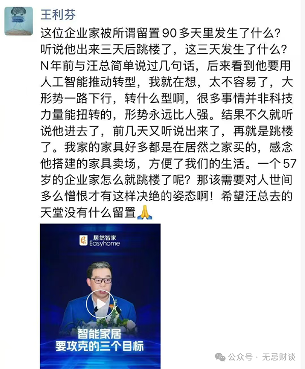 主持人王利芬回忆说:汪总说要用人工智能推动转型,我在想太不容易了,大形势一路下行,转什么型,形势永远比人强。一个57岁的企业家怎么就跳楼了呢?那该需要对人世间多么憎恨才有这样决绝的姿态啊。