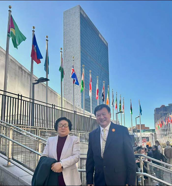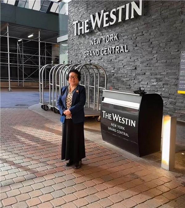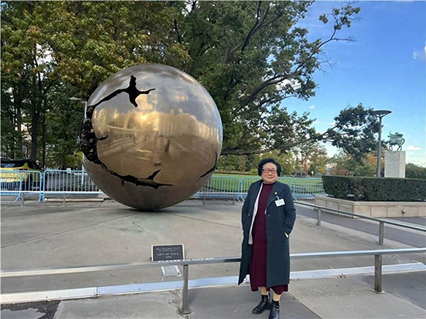 龚巧玉院士在联合国八十周年庆典活动期间于联合国二号大楼前留影