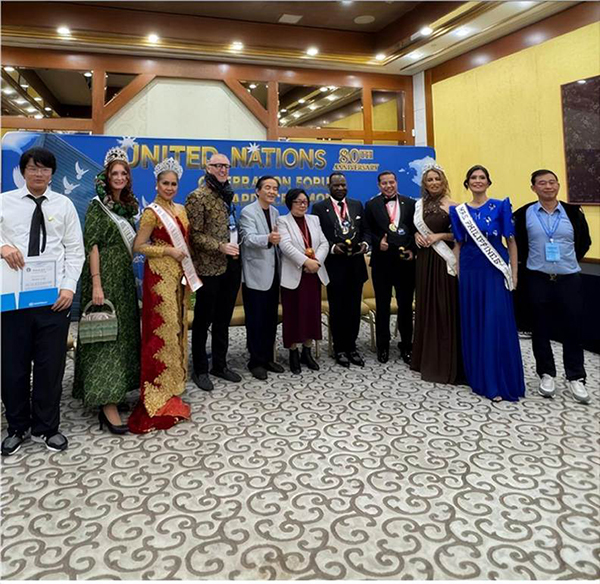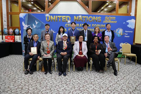 在联合国八十周年庆典活动上大会组委会主席团与加州大健康代表团获奖嘉宾合影