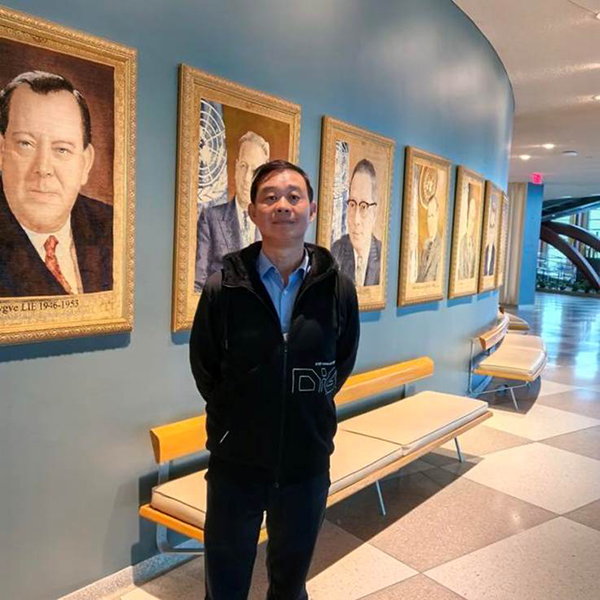 虞中仁先生于纽约总部联合国大夏旗帜前留影
