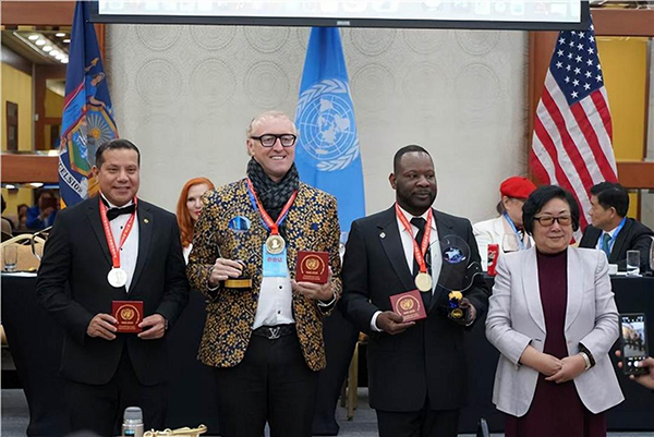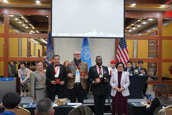 1.龚巧玉院士在联合国八十周年庆典活动上给大会组委会共同主席团赠送全球水联盟金牌合影