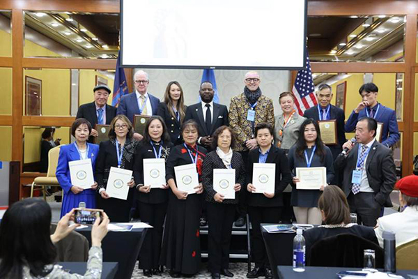 龚巧玉院士作为大会共同主席,大会主席团荣誉主席杰夫王、大会顾问团龚云定,荣誉主席虞中仁,大会执行副主席兼秘书长Athena Goodman与加州代表团和获奖企业家、艺术家合影:国际著名绘画艺术家陈溢华先生,陈万祥先生,Huihong zhao女士,道森医学博士慈善家,谢明月艺术家,荣获联合国80周年庆典活动”杰出慈善奖“