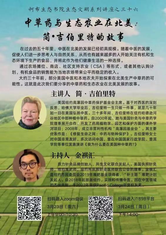 2024年3月22日,柯布生态书院生态文明系列讲座第36场迎来了它的主讲嘉宾---美国纽约高瀑园中草药保护基金会主席简•吉伯里特女士(Jean Giblette)。吉伯里特女士演讲的题目是《中草药与生态农业在北美》。担任本次演讲主持人的是金祺汇先生, 金先生毕业于上海中医药大学和太平洋健康科学学院,是原力针灸品牌创始人,共生文化联合发起人;美国执照针灸师,纽约堆肥师,纽约州执照针灸医师联合公会的理事;纽约市民委员会2019年堆肥基金获得者,“补土派”堆肥计划发起人。自2018年起旅居纽约,实践和传播中医。因在中医领域的杰出贡献,于2022年荣获Pacific College年度校友奖。