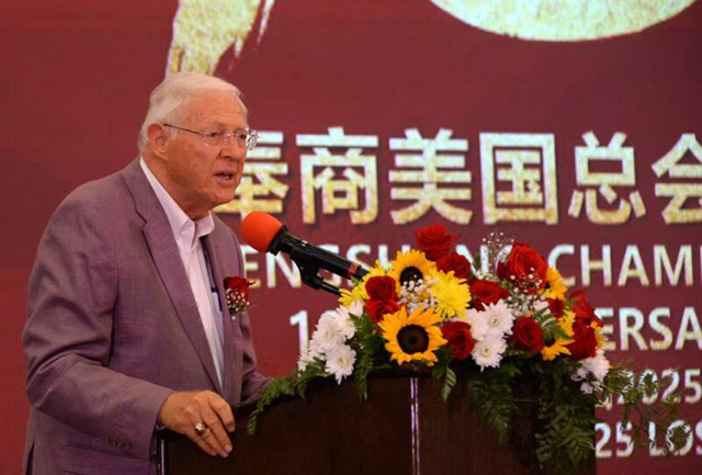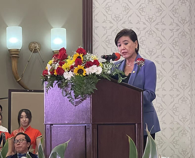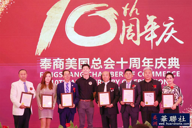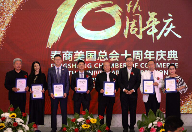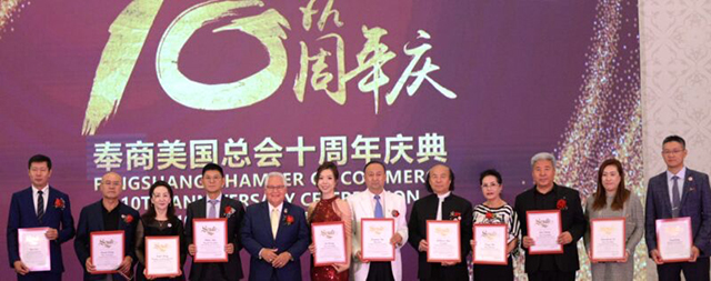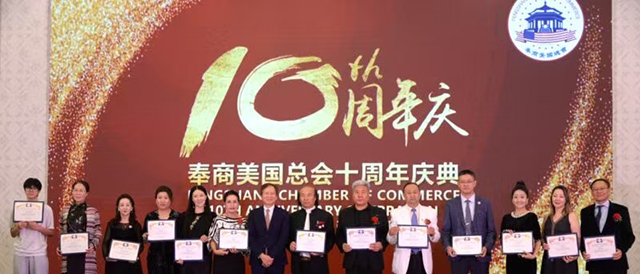 美国国会议员Judy Chu作为首位致辞嘉宾登台,她深情回顾与奉商美国总会的深厚渊源,坦言曾出席商会第一届就职典礼,亲眼见证其十年间不断发展壮大、成为中美经贸文化交流桥梁的全过程。她高度肯定商会的重要贡献,并为朱俊英、William翟、孙英丽、张军、孙伟等十位商会领导颁发贺状,合影留念。