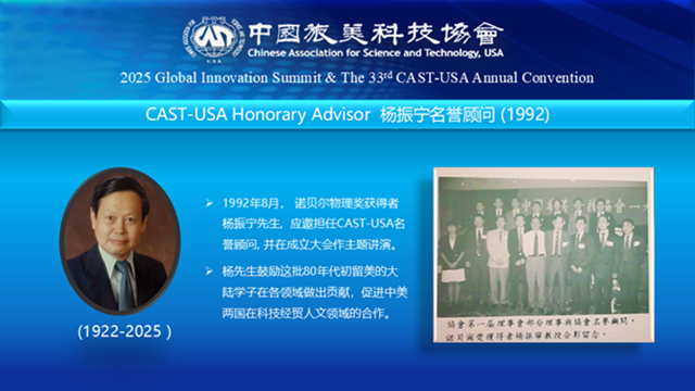 会上还对刚刚去世不久的杨振宁先生进行了悼念和追思。中国旅美科协董事会主席谢家叶博士回忆到,杨先生在旅美科协的初创时期,即应邀担任了协会的首届名誉顾问并在成立大会作主题讲演。他其后数次来到协会,指导和勉励广大会员在科学的道路上努力开拓,为中美科技发展和交流做出贡献。杨先生的谆谆教诲和勇于创新、敢于发现的科学精神,将永远引领我们在科学的道路上砥砺前行,为人类的科技发展和交流做出更大的贡献。