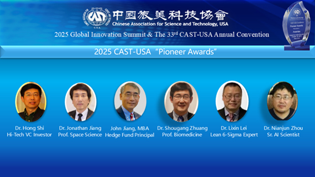 中国旅美科协2025年度《科技先锋奖》分别授予了六位备受相关研究领域关注并已多次取得突破性贡献的科技创新先锋。包括科技风险投资家、红石诚金创投基金创始人石宏博士,美国宇航局NASA加州理工学院喷气推进实验室的高级研究科学家、卫星遥感空间科学领域专家蒋红涛教授,美国大型对冲基金公司经理、中国结构化金融领域的早期推动者蒋晓鹏,美国布朗大学医学院内科学系教授、急慢性肾损伤的发病机制及药物干预的研究领域专家庄守纲教授,VLEI Institute创始人兼CEO、为全球企业提供定制化精益六西格玛管理系统领域专家雷立新博士,人工智能高级科学家、美国IBM T.J.华生研究中心资深研究员周念军博士。