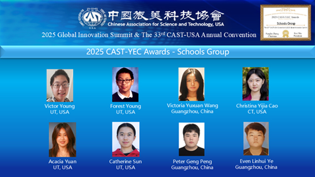 在颁奖典礼上,同时揭晓了2025年度中国旅美科协“CAST-YEC全球青少年科技创新挑战大赛奖”。旅美科协北京办事处主任王晓阳教授和北京办事处理事长朱敏红博士分别颁发了大学组和中学组的获奖名单并颁奖。他们对各获奖项目的选题和对中美科技以及文化交流的寓意和影响,寄予了广泛的肯定和高水平的专家点评。
