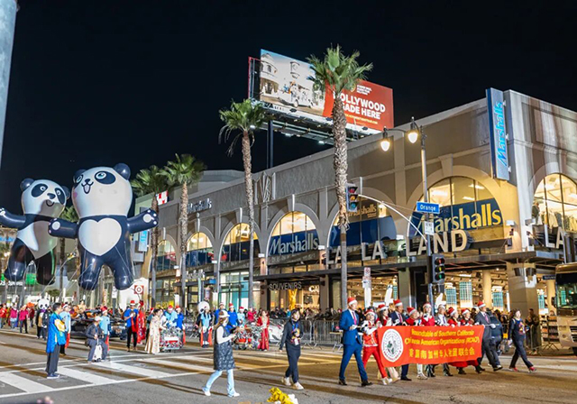 好莱坞圣诞大游行始于1928年,是具有悠久历史的大型新年庆祝活动。今年的游行队伍包括逾百位好莱坞名流、美国海军陆战队军乐团等行进乐队、生动形象的巨型卡通气球、充满喜庆氛围的五彩花车以及各族裔多元文化展示与歌舞表演,向观众送上美好的节日祝福。