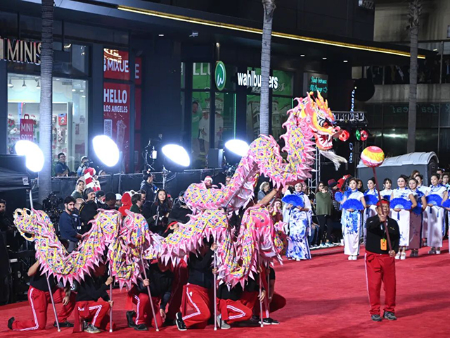 南加州华人社团联合会组织了近200人的游行队伍,舞龙舞狮、中华武术、哪吒、旗袍与民族服饰、高达8米的“大熊猫”气球、京剧变脸等方阵赢得现场观众阵阵欢呼和掌声。游行队伍向沿街观众赠送熊猫玩偶,引发热烈反响和积极互动。