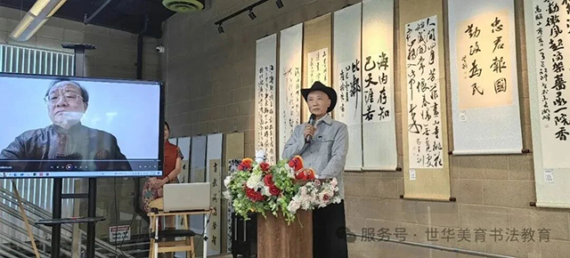 美国中华文化研究中心主席蔡德贵教授在主旨发言中分享了季羡林先生对书法艺术的独到见解,从汉字的起源与构造追溯文明根脉,梳理书法艺术数千年的演变脉络,生动讲述了多位书法名家的艺术风格与轶事典故。他强调,书法兼具实用价值、艺术价值与陶冶情操的精神价值,作为中华文化的璀璨瑰宝,不仅是文人墨客的精神寄托,更是跨越语言的文化交流载体,鼓励海内外学者积极参与书法练习,以笔墨传承文明、增进中外理解。著名艺术家庄景辉教授、美国爱睿星教育集团王锋博士也分别从艺术传播、文化交融的角度发表见解,世界华人美术教育协会会长张幼云教授特意发来视频祝贺,寄语展览成为中外文化互鉴的坚实桥梁。