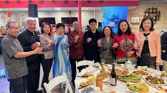 給祖国人民拜年(右起:William、石丽、朱俊英、张勇、黄晓冬、李志富和夫人、张军和奉商美国总会领导)