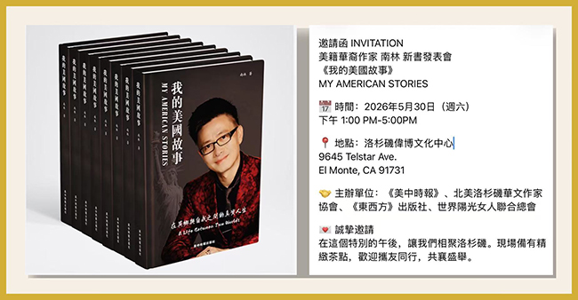 为庆祝美国建国250周年,展现华裔移民奋斗历程、搭建东西方文化交流桥梁,美籍华裔作家南林新作《我的美国故事》(美中时报出版社出版)新书发表会,定于2026年5月30日下午,在洛杉矶伟博文化中心(9645 Telstar Ave., El Monte, CA 91731)隆重举行。