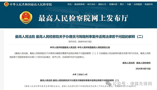 2026年4月10日,最高人民法院和最高人民检察院联合发布《关于办理贪污贿赂刑事案件适用法律若干问题的解释(二)》,将于2026年5月1日起实施。