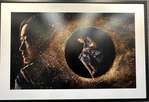 一幅融合视觉冲击与哲思深度的作品。画面中星尘般的光影流转、双重人物构图与金黑色调交织,探索女性内心的宇宙、自我对话以及梦境与现实的模糊边界。既唯美,又发人深省。