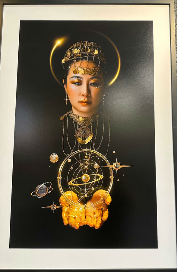 人物头戴金属币状头饰、身披星辰图腾,令人联想到中亚、波斯或西域古文明中象征财富、权力与神意的女王形象。金色妆容、耳饰与项链相映成辉,构建出一则融合宗教、天文与女性力量的视觉神话。
