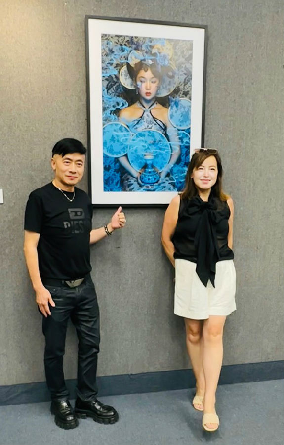 为表达我的敬意与支持,我收藏了Alex的一幅代表作一一《Porcelain Butterfly》(青花蝴蝶)。这幅作品融合东方美学与超现实意象,画面中的女子怀抱青花瓷瓶,身后环绕着仿佛蝴蝶翅膀般的青花图纹圆环,使她与瓷器融为一体-一既是守护者,也是瓷魂的化身。青花瓷象征中国文化的细腻与历史感,而蝴蝶则寓意蜕变、美丽、梦境与生命的脆弱。