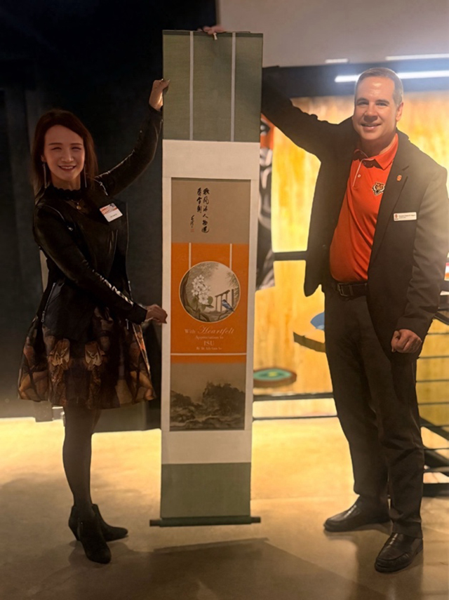 这场在波特兰举行的赠画仪式,不仅是一段温暖的校友情谊,更象征着教育与艺术精神的再度交融。罗伯特·瓦格纳博士以开放与远见带领 ISU 走向更具包容与创新的未来,而盖亚·叶丽博士的艺术长卷,则以丝绢与色彩回应了这一精神——将东方的千年笔墨与西方的大学理想在同一画面中相遇。作品的收藏,不仅是一次艺术的认可,更是一种文化的传递: