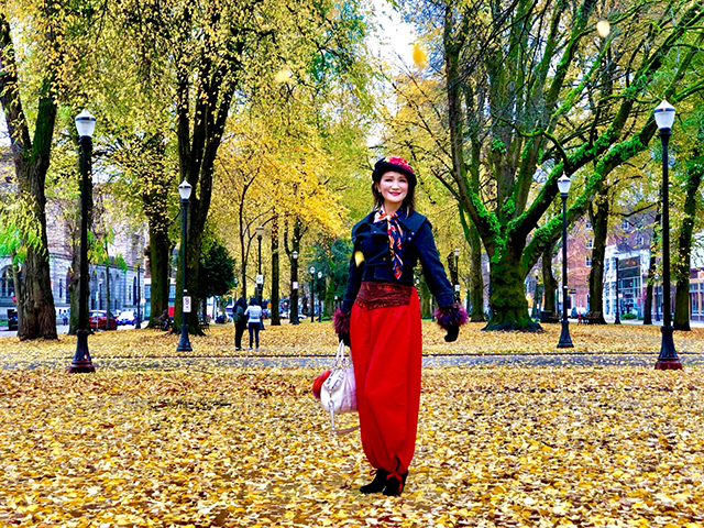 Dr.Lily Gaia Ye in downtown Portland, Autumn 2025 — walking through the goldenfoliage that mirrors the poetic spirit of her art. (Photo courtesy of GAIA)
