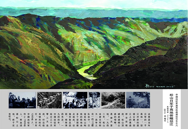 由此开始了他长达十余年的创作。行程4000多公里,走遍了当年中国远征军滇西抗战的主要战场遗址采风写生,历时十余年完成了《中国远征军祭》系列创作。刘榕用绘画作品诉说文字书写的历史,以艺术语言再现战争的惨烈与人性的光辉,既是对历史的追忆,也是对和平的呼唤。之后的三年间,刘榕完成了中国远征军祭系列作品的代表作《滇西记忆》,永久陈列再云南腾冲滇西抗战纪念馆。