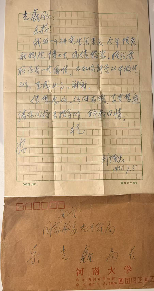 考试结束后,我从北京返回河大,第一时间便去向刘老师汇报情况。刘老师关切地询问我考试发挥如何,我坦言整体感觉尚可,但对于最终能否被录取,心中仍无十足把握。刘老师听罢,当即告诉我,学校有一位老校友正在国家教委老干部局担任局长,建议我前去拜访,请其予以关照。话音未落,他便铺开桌上信纸,提笔为岳光鑫局长亲笔修书一封,恳请对方“从中斡旋,玉成此事”。只是后来北京方面有了新的消息,这封信最终未能来得及面交岳局长。即便如此,刘老师一心为学生前途着想、倾力相助的热忱,已在这件小事中展露无遗,令人感念至深。