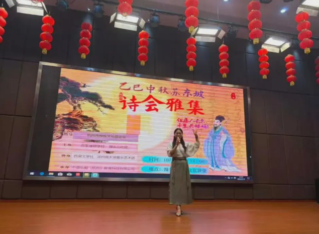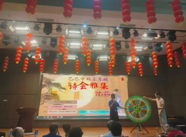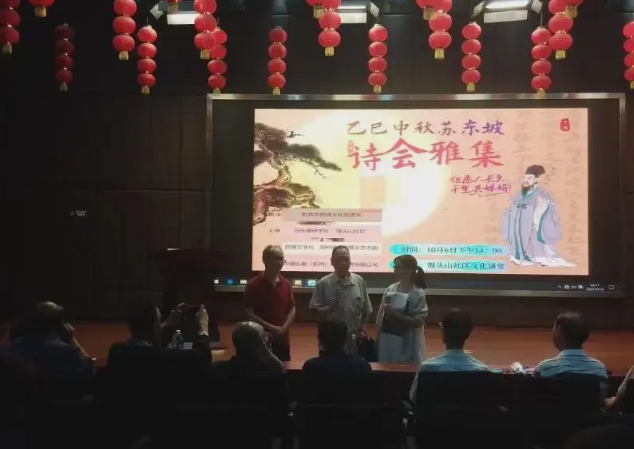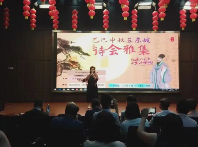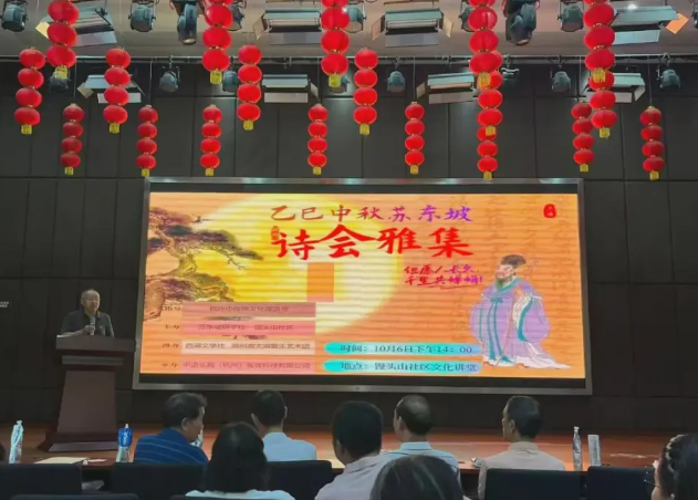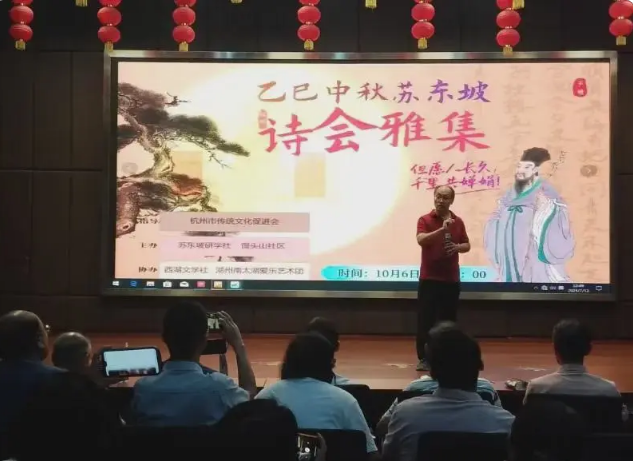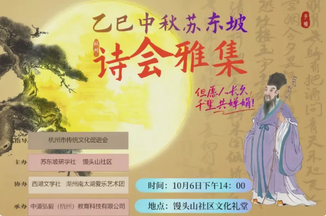 10月6日杭州苏东坡中秋诗会雅集在凤凰山南麓馒头山社区举行。这里是苏东坡曾经居住和办公的地方,也是北宋州治所在地,南宋皇城所在地。杭州苏东坡中秋诗会雅集由杭州市传统文化促进会指导,苏东坡研学社、馒头山社区共同主办,杭州西湖文学社、湖州南太湖爱乐艺术团、湖南源派文化传媒有限公司协办,中道弘毅(杭州)教育科技有限公司承办。北京、广东惠州、美国纽约等地联动举办。杭州会场50余人参加诗会雅集,由杭州苏东坡中秋诗会雅集策划人、哈佛大学访问学者、浙江大学兼职教授、杭州市苏东坡文化研究会发起人谌卫军和杭州阳明学研究会副秘书长钟静灵主持,大家在一起孜孜以求心心相印美美与共,传承中华优秀传统文化,搭建世界华人交流平台,打造中秋文化国际品牌。
