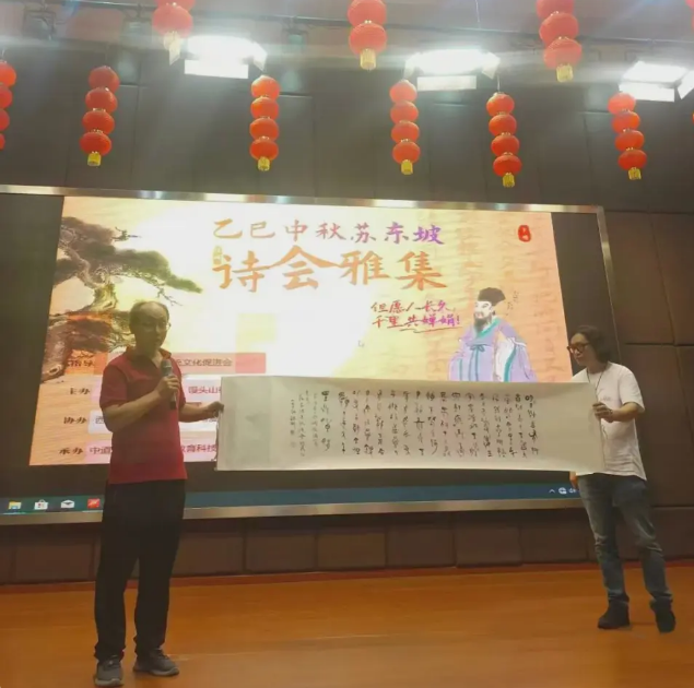 著名书法家夏有祥先生赠送书法作品:《苏东坡中秋诗会雅集》,徐徐展开,端庄典雅,诗会雅集正式开始。